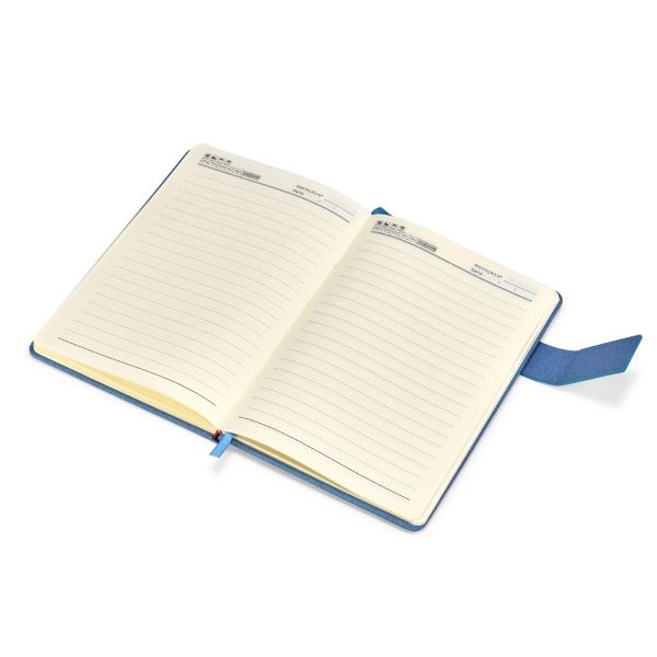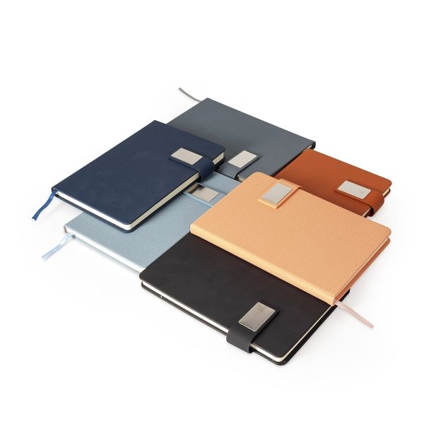Descrição: Caderneta capa dura em couro sintético com fecho magnético, placa metálica personalizável, além de marca-página em fita de cetim e aproximadamente 96 folhas brancas pautadas.